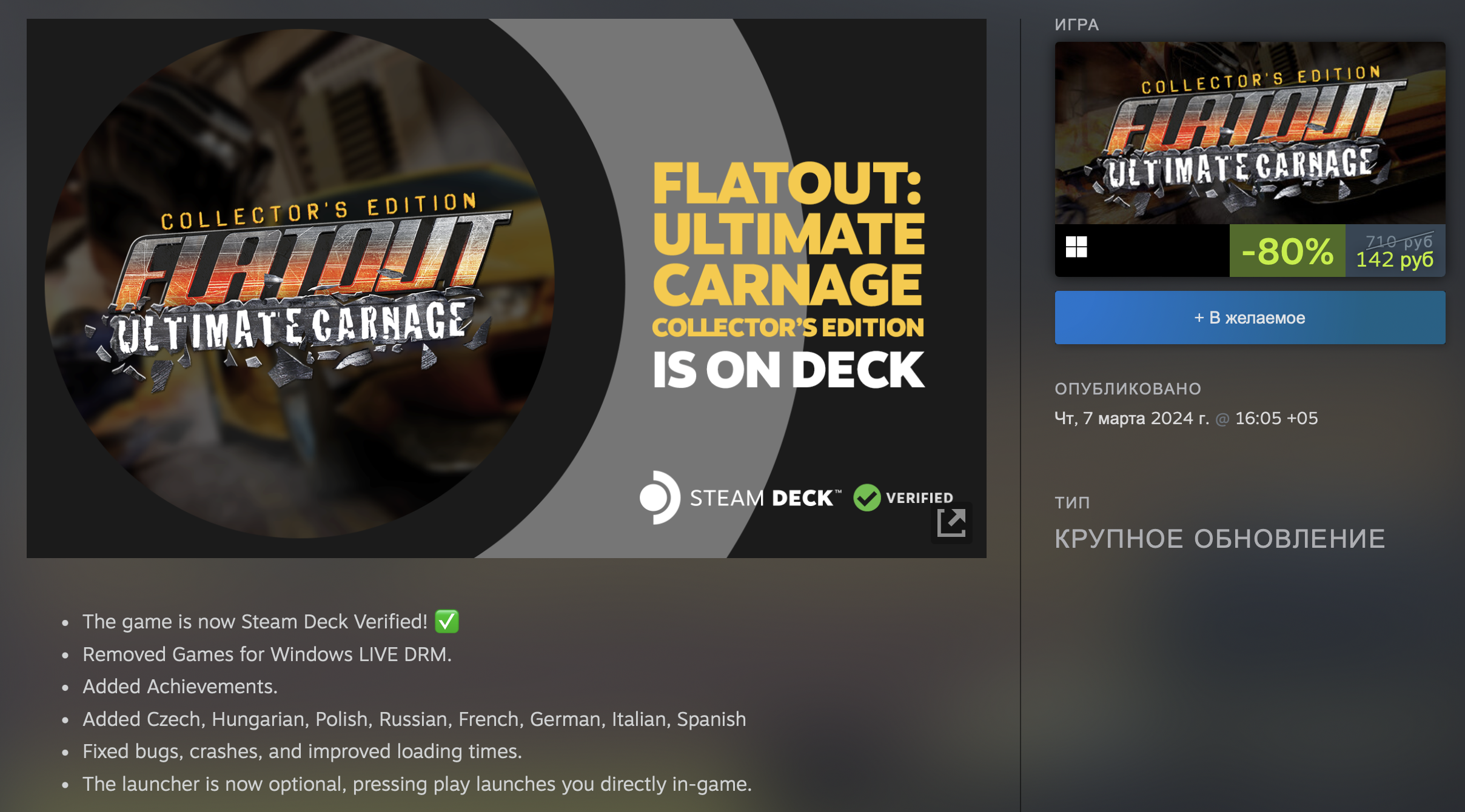FlatOut: Ultimate Carnage от финской студии Bugbear Entertainment обзавелась крупным патчем. С момента выхода последнего апдейта прошло без малого 15 лет. Кроме того, безбашенный симулятор гонок с вылетающими из лобовых стекол водителями оптимизировали для Steam Deck.
