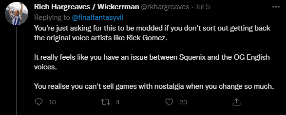 «Вы просто нарываетесь на многочисленные моды тем, что не возвращаете оригинальных актеров вроде Рика Гомеза (озвучил главного героя в оригинале — прим. ред.). Такое чувство, будто между Square Enix и обладателями оригинальных голосов есть какой-то конфликт. Вы понимаете, что не можете продавать игры ностальгией, если столько всего меняете?»