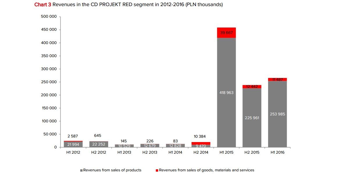 CD Projekt RED отчиталась о финансовых поступлениях за первую половину 2016 года. Доход компании в пересчете на доллары равняется 82,7 миллионам. Прибыль получилась на уровне $35 миллионов. Это ниже показателей аналогичного периода за прошлый год: тогда доход и прибыль составили 133 и 61,2 миллиона долларов соответственно. Но релиз The Witcher 3: Wild Hunt состоялся аккурат в мае 2015 года, что положительно повлияло финансовую ситуацию.
