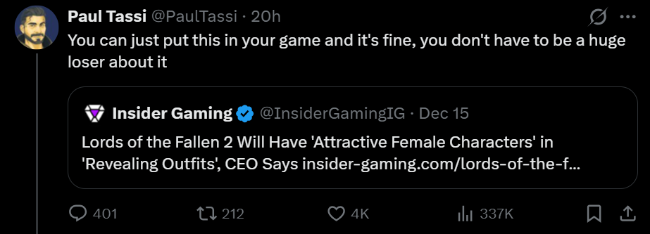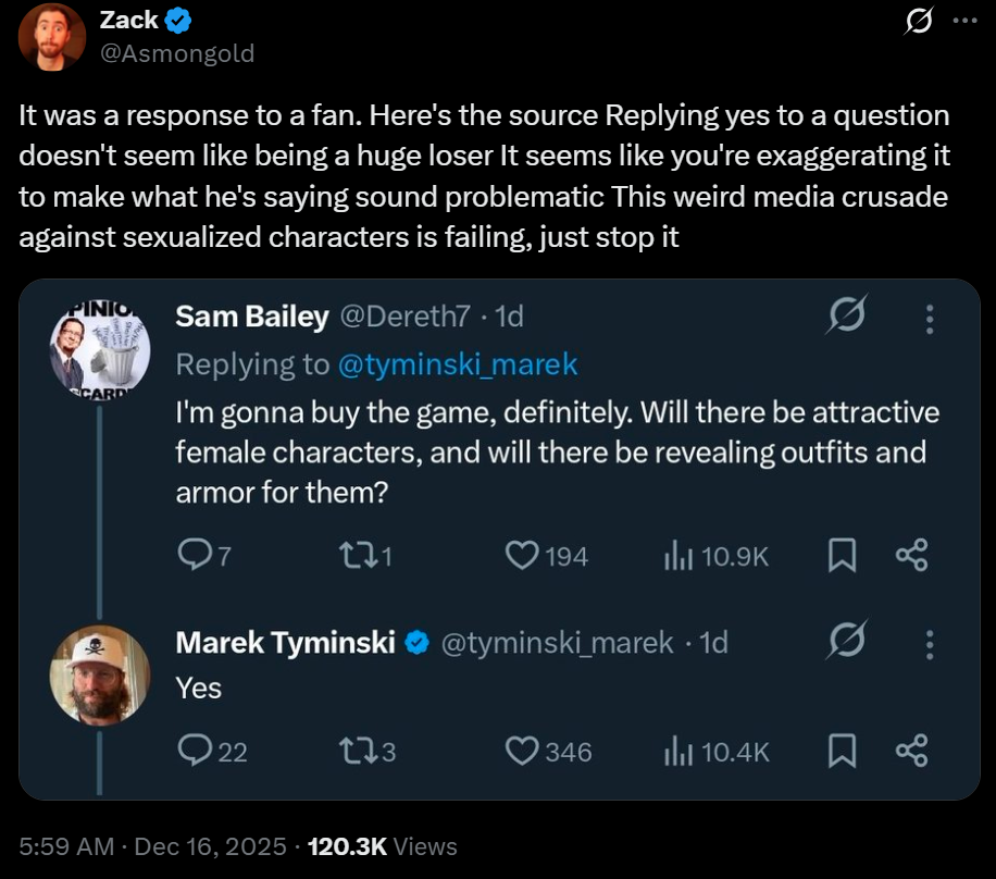 Своеобразным катализатором стала публикация Insider Gaming. Ее авторы подали слова Марека Тыминьского как заявление. Словно он собрал всех журналистов мира и вышел со словами: «Вот мы какие интересные, сделаем секси-чик в следующей игре». На деле Тыминьский просто ответил на вопрос геймера, которого интересовало наличие привлекательных дам в следующей части «соулс-лайка». Тасси слегка возбудился от статьи Insider Gaming и написал в X, что «можно просто добавить это в игру и не быть при этом жалким неудачником». Его комментарий вызвал ответ от популярного стримера Asmongold, который посчитал слова журналиста преувеличением и попыткой искусственно создать проблему.