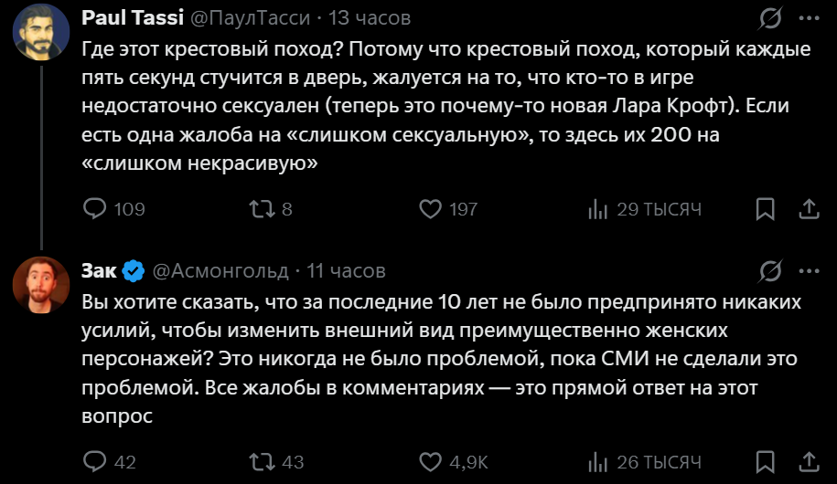 Тасси в ответ заявил, что никакой «кампании» против сексуальности в играх не существует, а напротив — в сети гораздо чаще встречаются жалобы на то, что персонажи «недостаточно привлекательны». Он привел пример обсуждений вокруг новой Лары Крофт, внешностью которой геймеры все равно недовольны. Asmongold парировал, что именно медиа за последние десять лет сделали тему внешности женских персонажей проблемной, и нынешние комментарии игроков — это реакция на подобное давление.