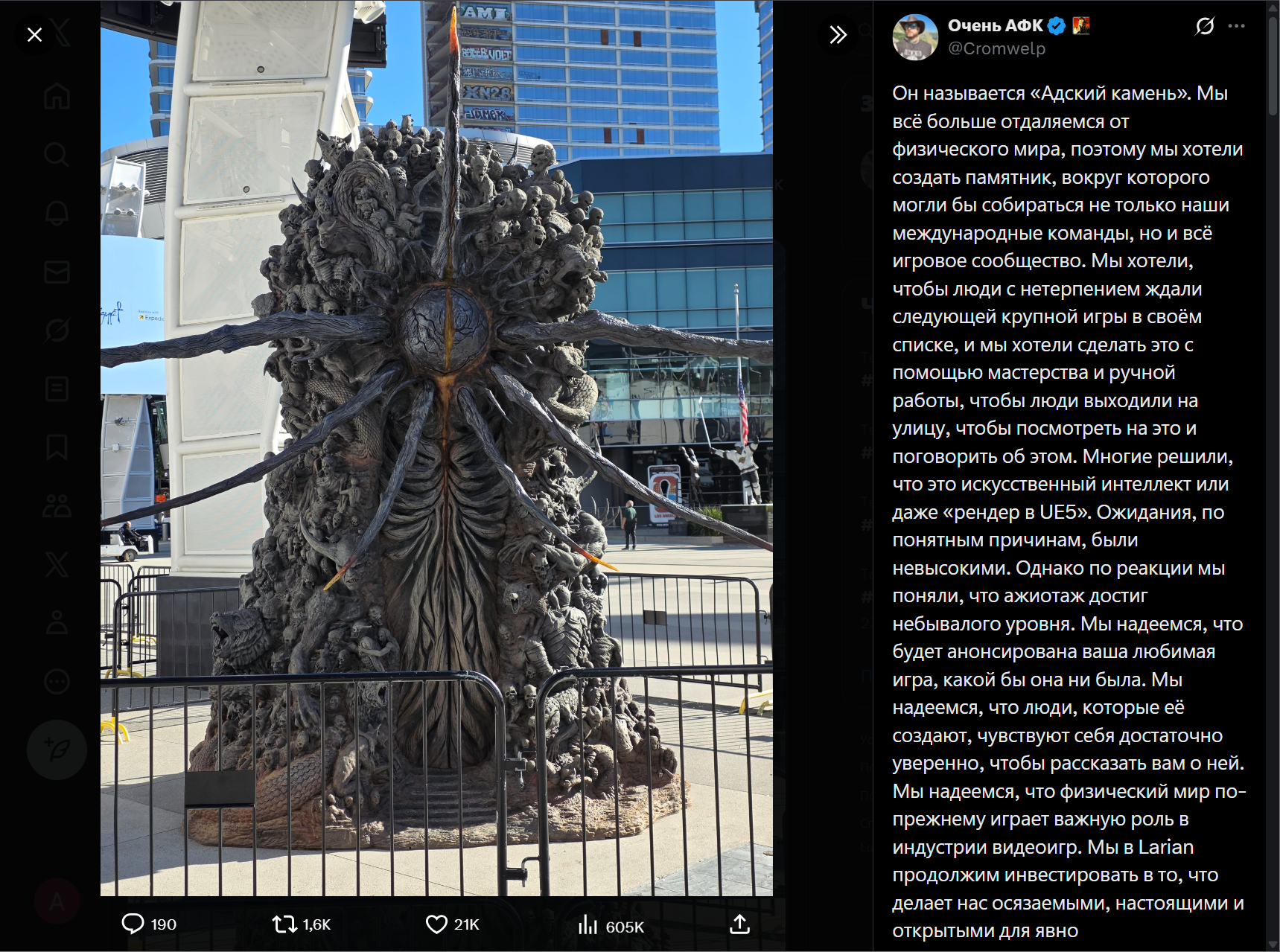 Одновременно с этим Larian раскрыла тайну загадочной статуи, которая на прошлой неделе стала вирусной. Коммьюнити-менеджер Майкл Даус, известный в соцсетях как Cromwelp, объяснил, что это физический арт-объект, созданный вручную, а вовсе не ИИ-арт или рендер на Unreal Engine 5, как предполагали некоторые. Статуя, которую Larian назвала «Адский камень» (Hellstone), была задумана как способ вернуть геймерское сообщество к физическому миру.