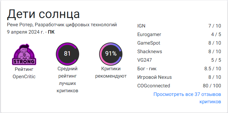 В Steam картина еще более приятная для авторов. Несмотря на считанные десятки пользовательских ревью, в 94% из них игру хвалят: