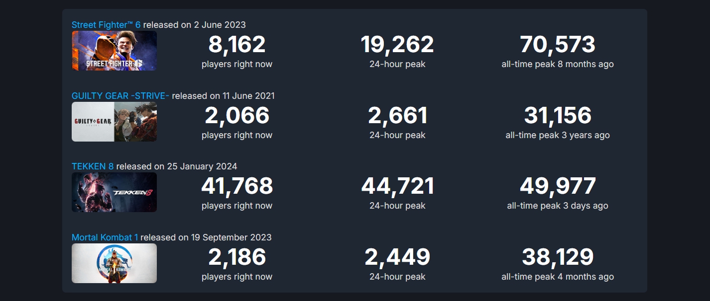 Помимо Mortal Kombat 1, новая часть Tekken обгоняет и Strive, но не SF6