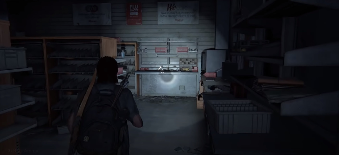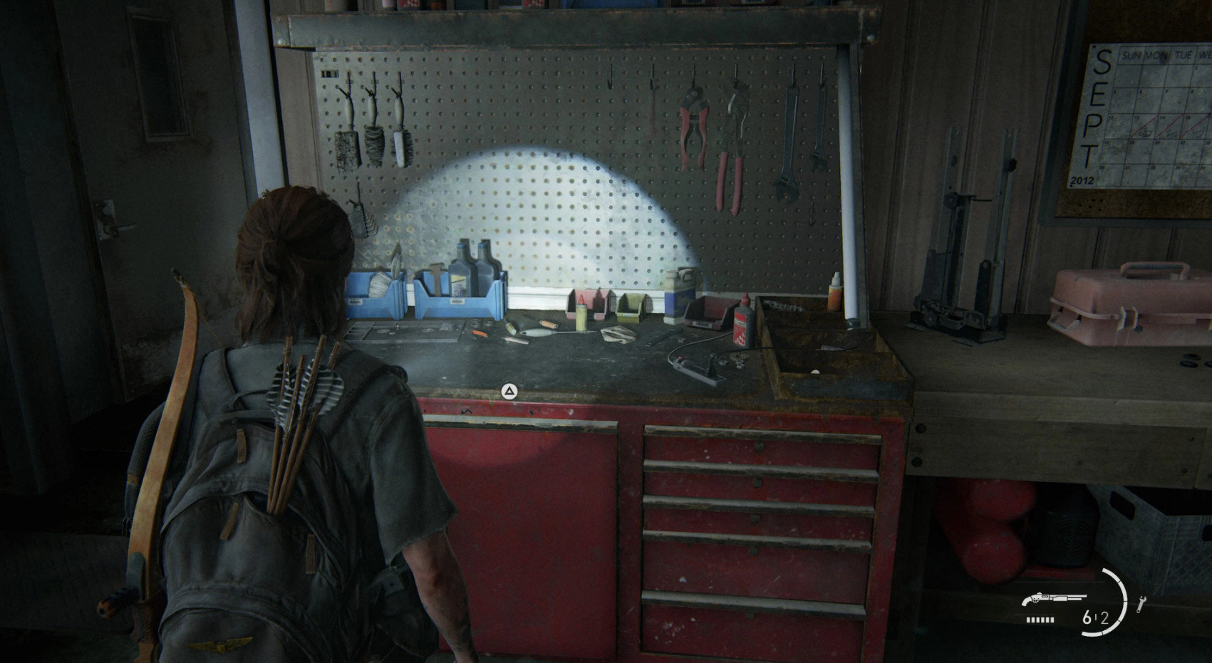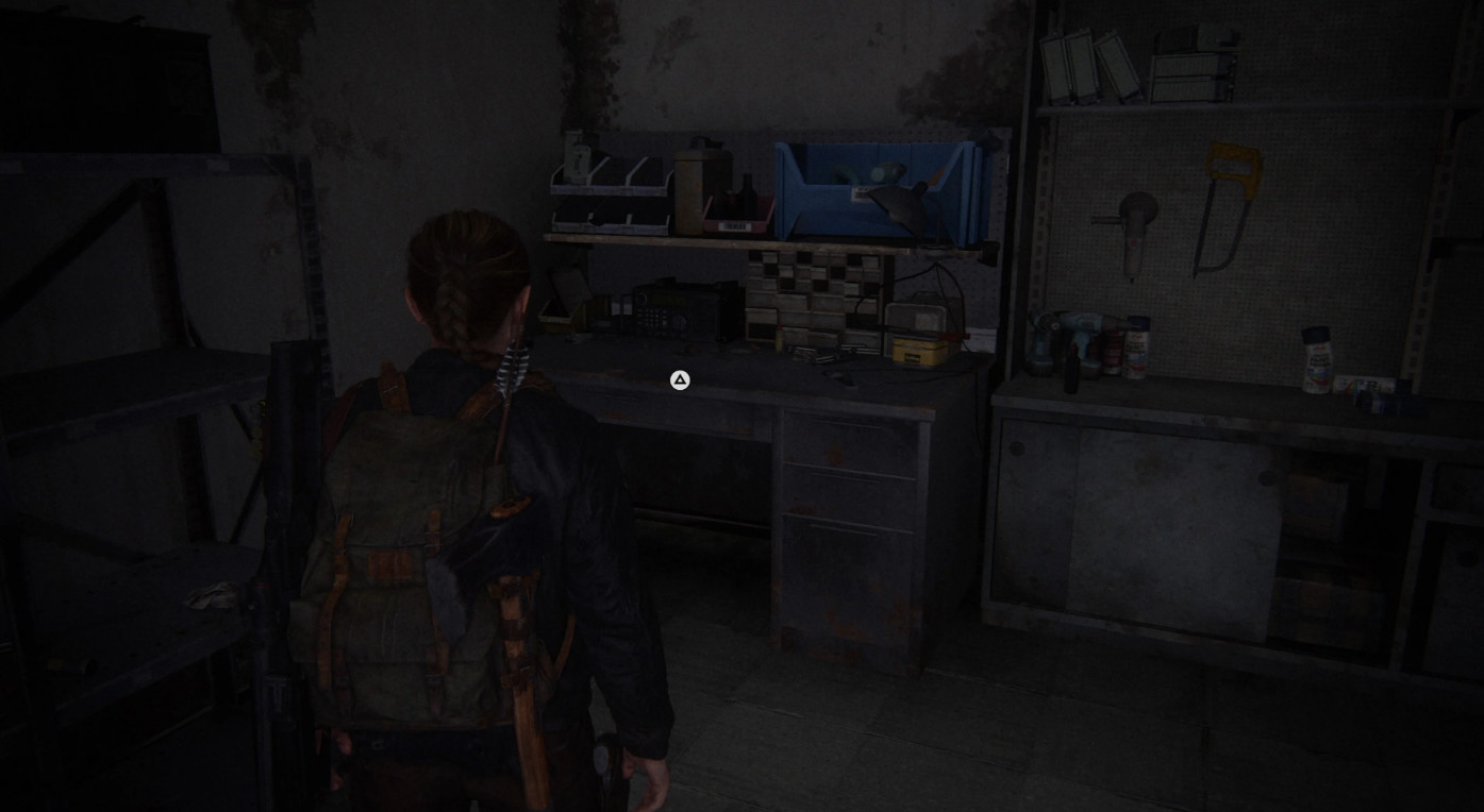 После того, как Элли заметит «мертвого Щелкуна», вам потребуется использовать веревку, чтобы достать лестницу. Прежде, чем это делать, изучите местность. Осмотрите место рядом с Щелкуном. Справа от него будет дверь, ведущая к верстаку.