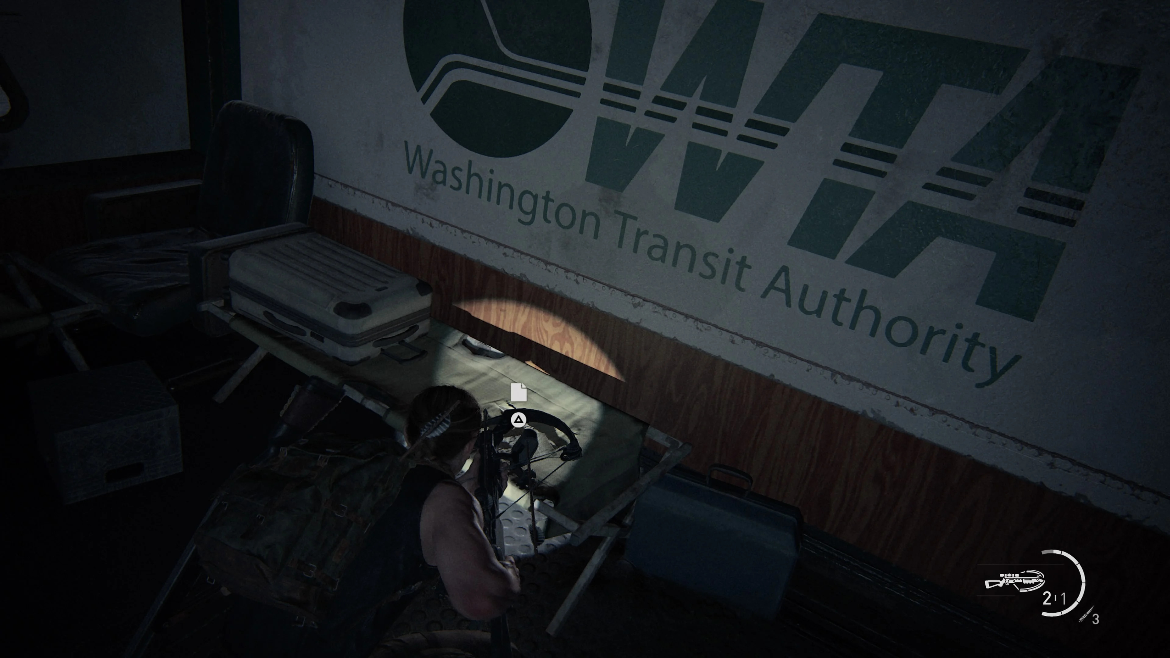 Вскоре после того, как вы заберете Арбалет у трупа, вы сможете проверить его на паре Щелкунов в нижнем этаже. Пройдите до конца коридора и посмотрите на кровать под вывеской Washington Transit Authority. Вы найдете артефакт справа от серебряного чемодана.