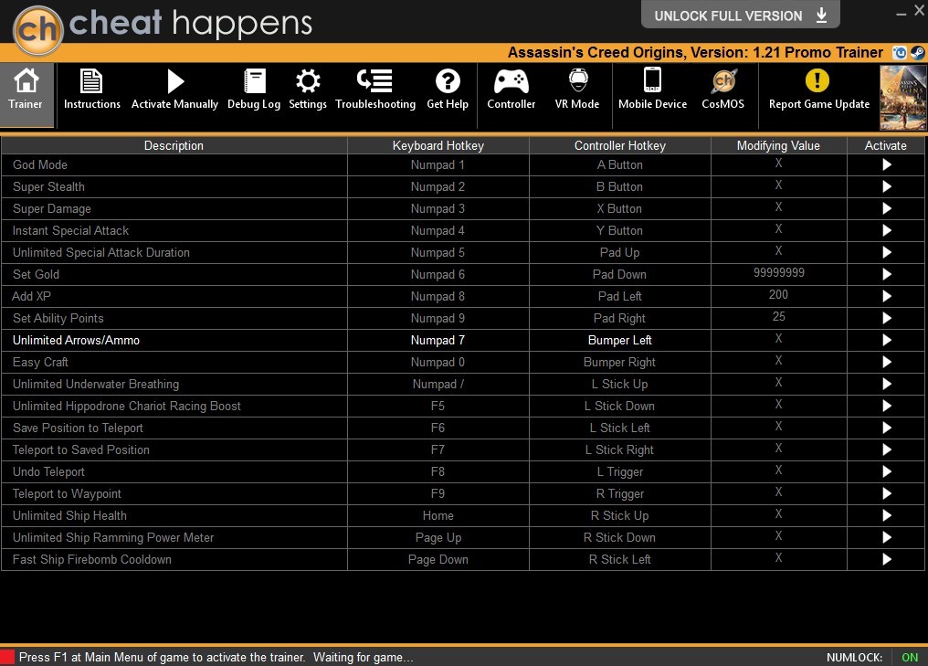 Трейнер +17 для версии 1.21 (PATCH 01.30.2018) от CheatHappens.com для Assassin's Creed Origins
