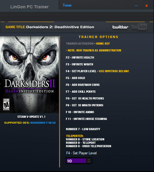 Трейнер +13 для версии 1.1 с установленным обновлением от 9.09.2016 от LinGon для Darksiders 2: Deathinitive Edition