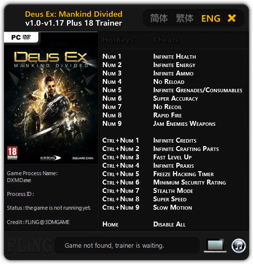 Трейнер +18 для версий 1.0 - 1.17 от FLiNG для Deus Ex: Mankind Divided