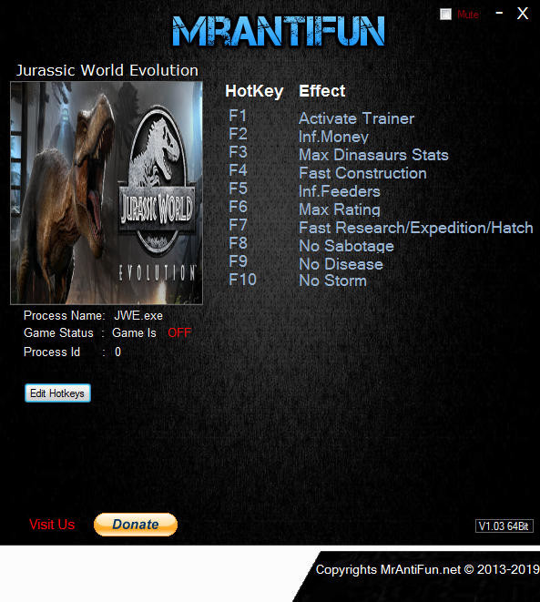 Трейнер +9 для версии 1.8.1.44654 от MrAntiFun для Jurassic World Evolution