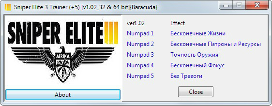 Трейнер +5 для версии 1.02 (x86) от Baracuda для Sniper Elite 3