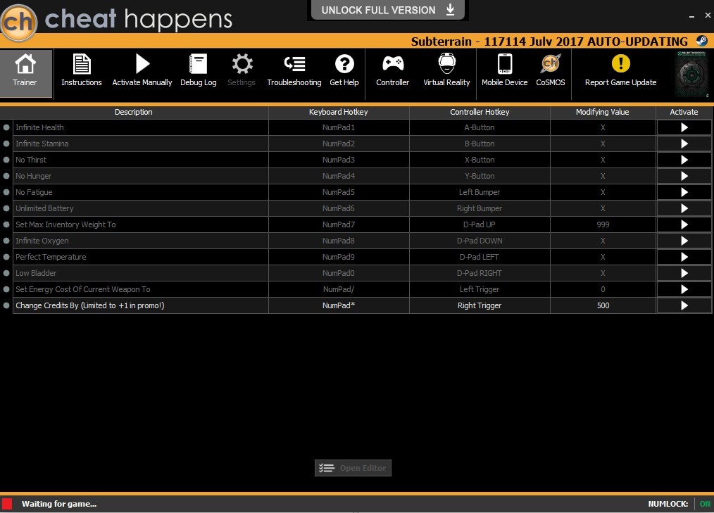 Трейнер +13 для версии 117114 JULY 2017 от CheatHappens.com для Subterrain
