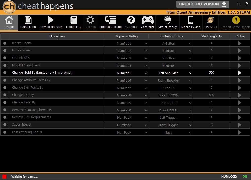 Трейнер +17 для версии 1.57 (STEAM+GOG) от CheatHappens.com для Titan Quest: Anniversary Edition
