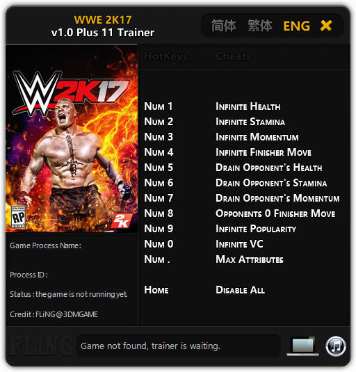 Трейнер +11 для версии 1.0 от FLiNG для WWE 2K17