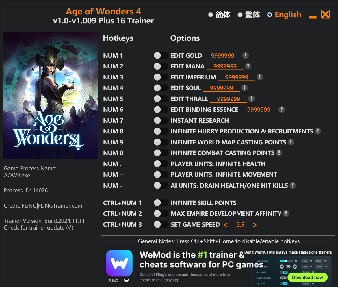 Трейнер для Age of Wonders 4 версии 1.009 от FLiNG +13