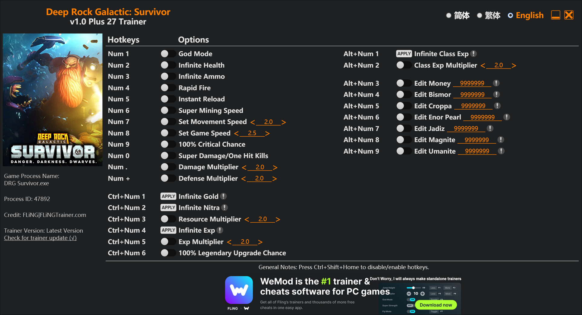 Трейнер для Deep Rock Galactic: Survivor версии 1.0 от FLiNG +27