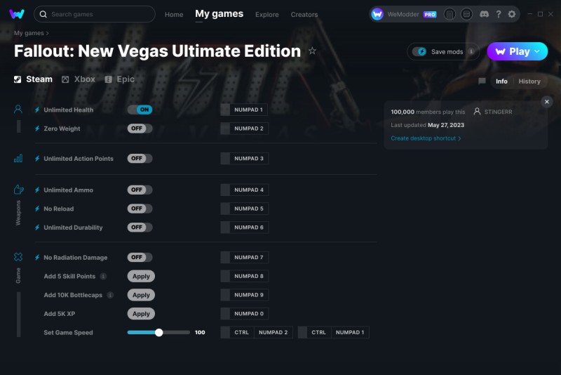 Трейнер для Fallout: New Vegas — Ultimate Edition версии 27.05.2023 от STINGERR / WEMOD +11