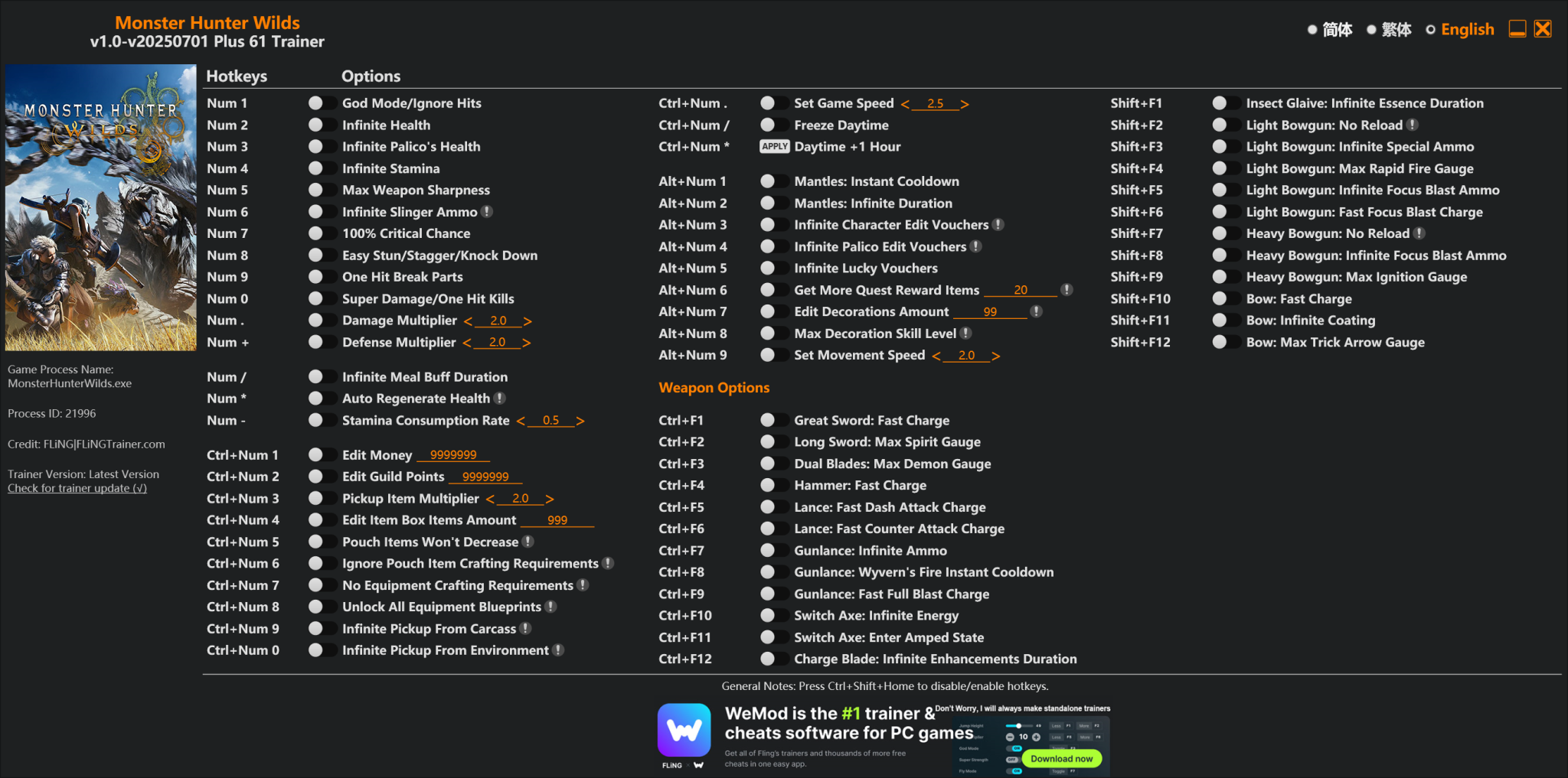 Трейнер для Monster Hunter Wilds версии 20250701 от FLiNG +61