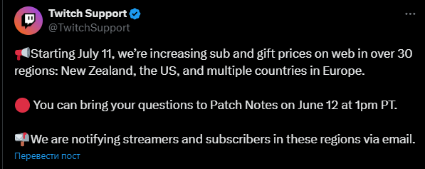 В официальном канале «Х», поддержка Twitch опубликовала пост о том, что с 11 июля они повысят цены на подписки, дополнительные услуги и подарки. Об этом они лично уведомили пользователей из Новой Зеландии, США и нескольких стран Европы по электронной почте.