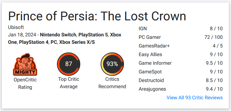 Ubisoft неожиданно выпустила что-то достойное, если верить оценкам прессы. Prince of Persia: The Lost Crown поразила игровые СМИ отличной динамикой, возвращением к 2D-перспективе, новыми идеями и общим исполнением. У игры свыше 85 баллов по OpenCritic.