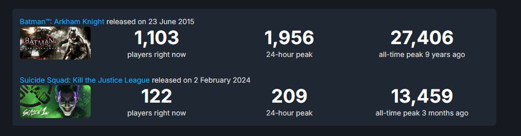 Для сравнения, у вышедшей почти десять лет назад Batman: Arkham Knight онлайн крайне редко падает ниже тысячи игроков.