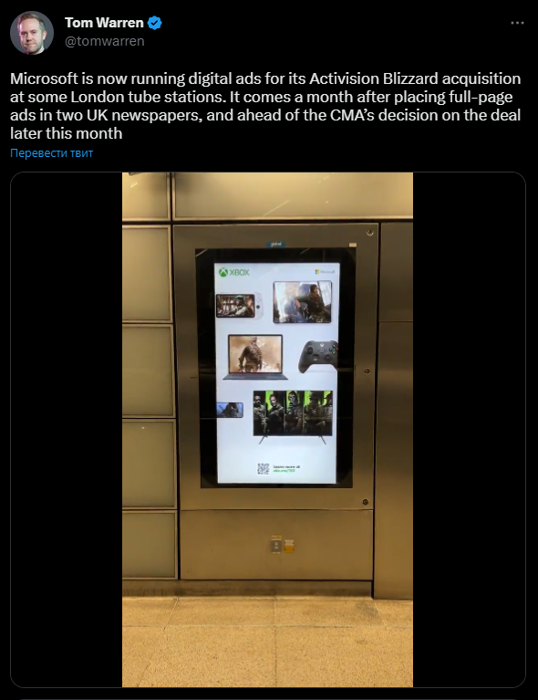 Редактор The Verge Том Уоррен заметил, что в метро Лондона появились цифровые баннеры, посвященные сделке Microsoft и Activision Blizzard. Рекламный ролик от Microsoft не особо информативный, но подчеркивает главный плюс для геймеров: «Call of Duty станет доступна для еще 150 миллионов игроков».