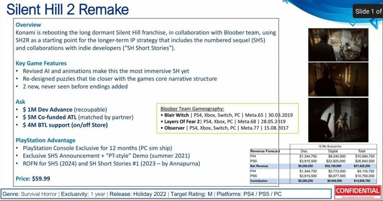 Судя по тексту на слайде, это будет ремейк в духе Resident Evil 2 и 3 от Capcom, только тут планировали еще и добавить две новые концовки. Игра должна была быть консольным эксклюзивом PlayStation (но с релизом на ПК) и выйти уже в этом году, но судя по всему был перенесен даже анонс. Также тут идет речь о Silent Hill 5, которую должны были анонсировать на конференции Sony и выпустить для нее что-то вроде P.T. еще в 2021 году, но что-то пошло не так.