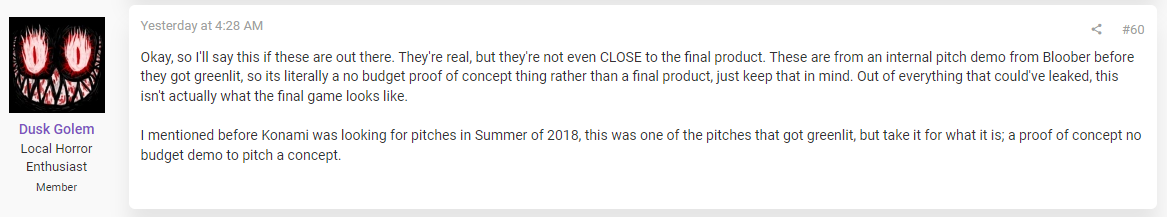 «Окей, ну раз уж это всплыло. Все правда, но это ВООБЩЕ не похоже на итоговый результат. Это скриншоты из внутреннего демо для презентации, после которого им выделили бюджет. То есть это дешевое наспех сделанное демо, держите это в уме. Это не то, как будет выглядеть игра. Я упоминал, что Konami искала подобные предложения в 2018 году, и конкретно этот питч был одобрен. Демо без бюджета для демонстрации концепта».