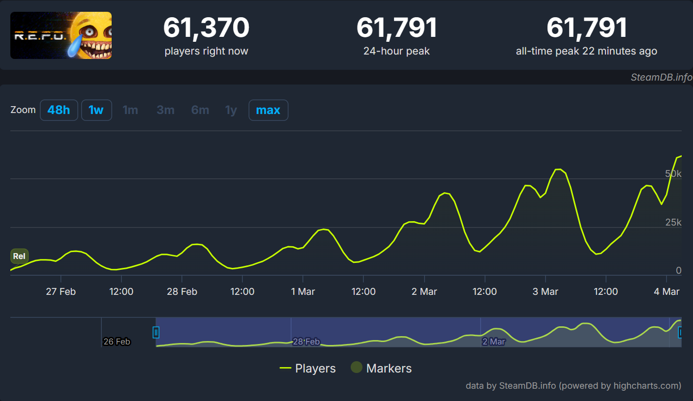 R.E.P.O. (сокращение от Retrieve, Extract, and Profit Operation) — это кооперативный хоррор, разработанный и выпущенный шведской студией Semiwork. Она получила почти 6000 отзывов, из которых 97% положительные, а пиковый онлайн достиг более 60 тысяч игроков.