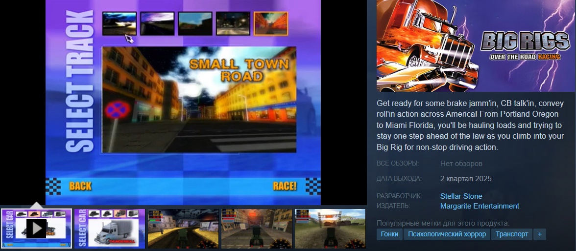На странице игры в Steam указан оригинальный разработчик Big Rigs, Stellar Stone, а вот издатель GameMill был заменен на некоего Margarite Entertainment — в закрепленном посте он написал, что приобрел права на Big Rigs и несколько других «классических» игр.