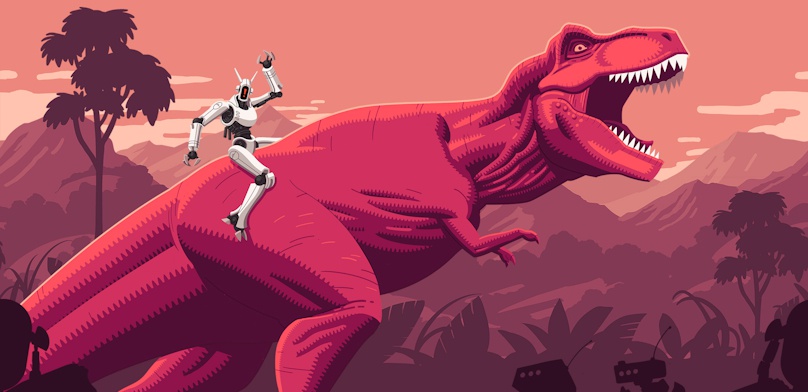 В магазине Steam стартовал фестиваль «Динозавры против роботов», предлагающий обратить внимание на игры с предками птиц и современными конкурентами человека. В рамках акции можно не только сэкономить при покупке некоторых проектов, но и бесплатно получить тематические сувениры — два анимированных аватара и один стикер: