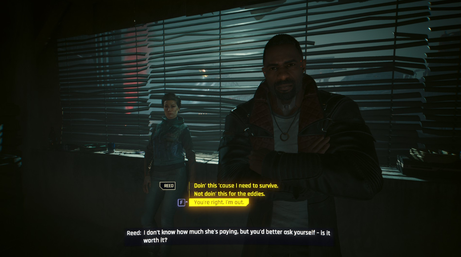 Примечательно, что спустя некоторое время игрок получит уведомление, что президент Розалиндс Майерс смогла сбежать из Найт-Сити — кто-то успешно выполнил работенку Ви. Конечно, обещанных привилегий главный герой не получит, а игрок не сможет увидеть новый вариант концовки.