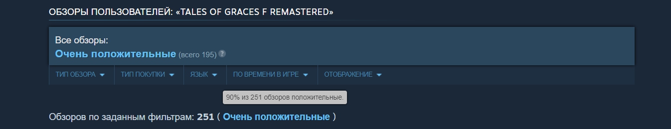 «Замечательная серия игр, всегда с нетерпением жду каждый ремастеред прошлых частей (комната ожидания порта tales of xillia 1/2 части), рекомендую к покупке однозначно. Поддержка русского есть, с технической стороны у меня вообще проблем нет (хотя в негативных отзывах пишут про проблемы с контроллером и клавиатурой, хз с чем это у людей связано, у меня все работает прекрасно)».