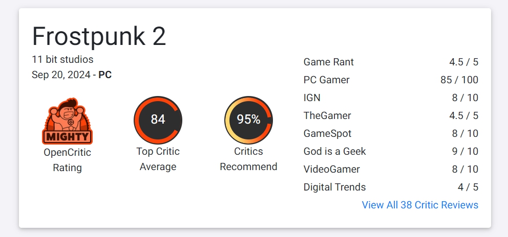 Game Rant: 9/10. «Frostpunk 2 снова переносит игроков на апокалиптичную Землю, где они смогут заняться строительством города и полученные ими впечатления вряд ли скоро забудутся».