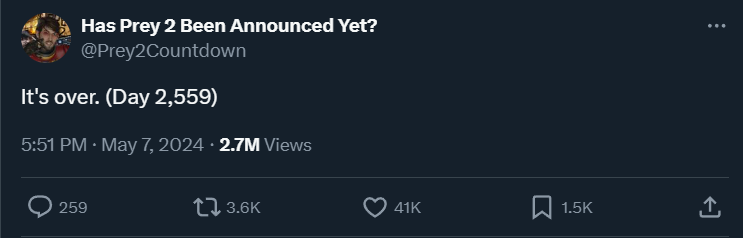 Microsoft, закрывшая Arkane Austin, убила надежду многих геймеров на продолжение Redfall. Простите, Prey. Один поклонник ждал анонса сиквела с 2017 года. Ежедневно он публиковал ответ на вопрос «анонсировали ли Prey 2» в соцсети X. Он делал это в течение 2559 дней. Но 7 мая стало для него последним.