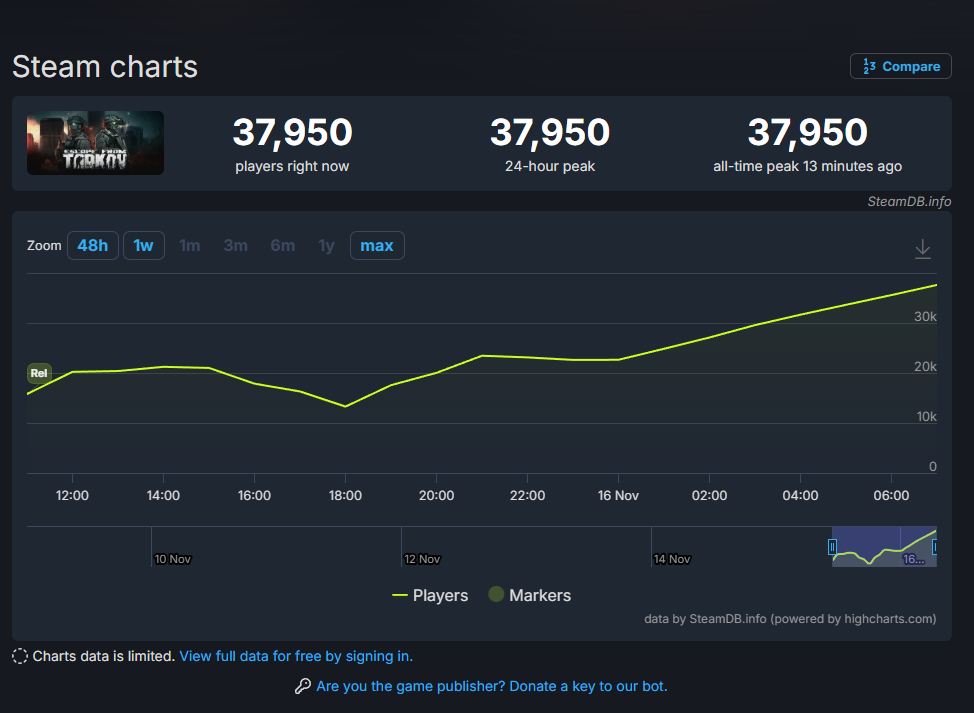 Те же, кому удалось просочиться сквозь перегруженные очереди, сообщают о массовых проблемах в матчмейкинге и подключении. В результате, согласно данным SteamDB, одновременно в игру смогли войти лишь 37 тысяч человек — и то уже сегодня. А в день релиза показатели редко превышали 20 тысяч.