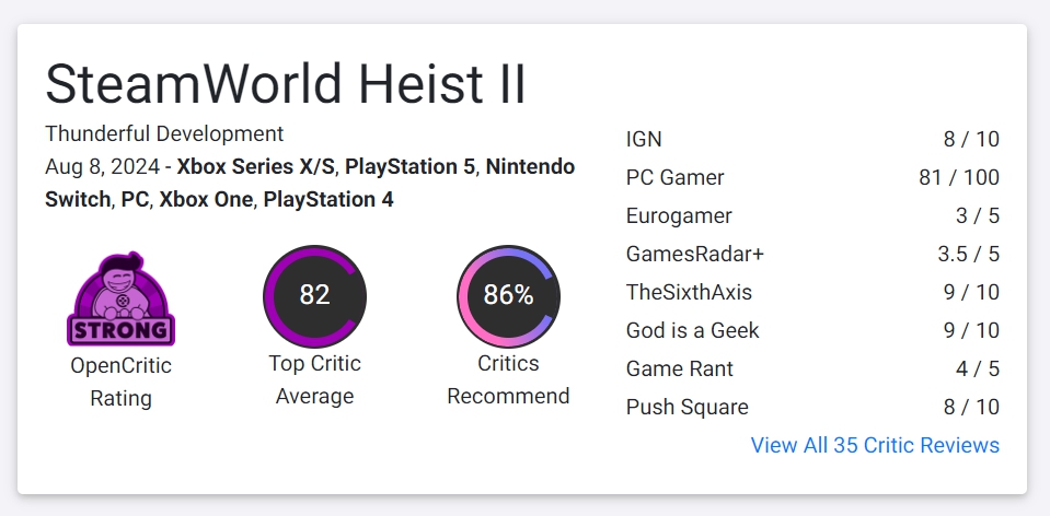 Game Rant: 8/10. «Steamworld Heist наконец-то получила долгожданное продолжение, и в конечном итоге это совершенно новое пошаговое приключение не разочаровало».