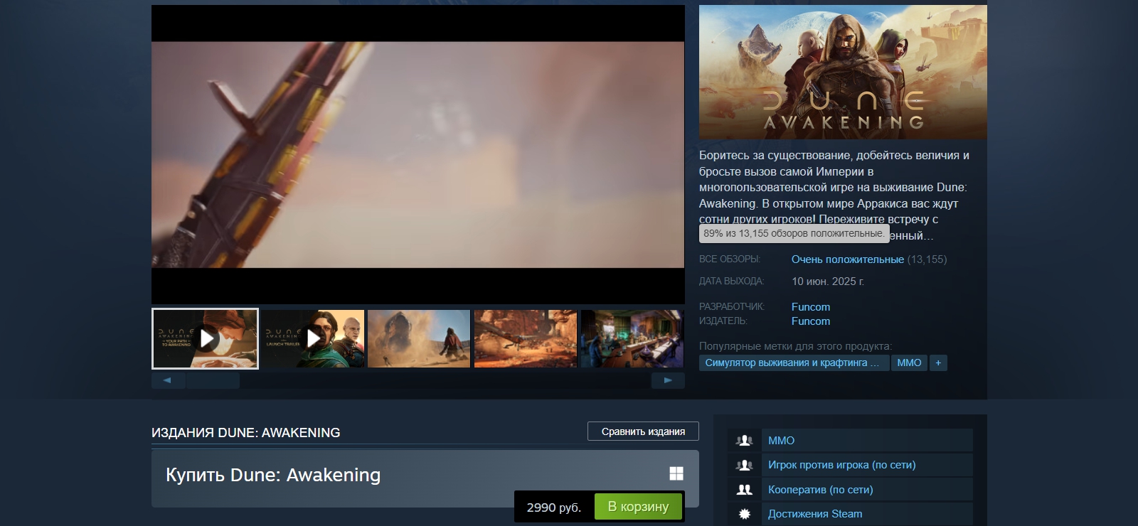 Новинка Funcom заметно полюбилась геймерам. Она собрала свыше 13 тысяч отзывов при рейтинге в 88% и уже обновила свой рекорд пикового онлайна. На момент написания новости он превысил 140 тысяч игроков.