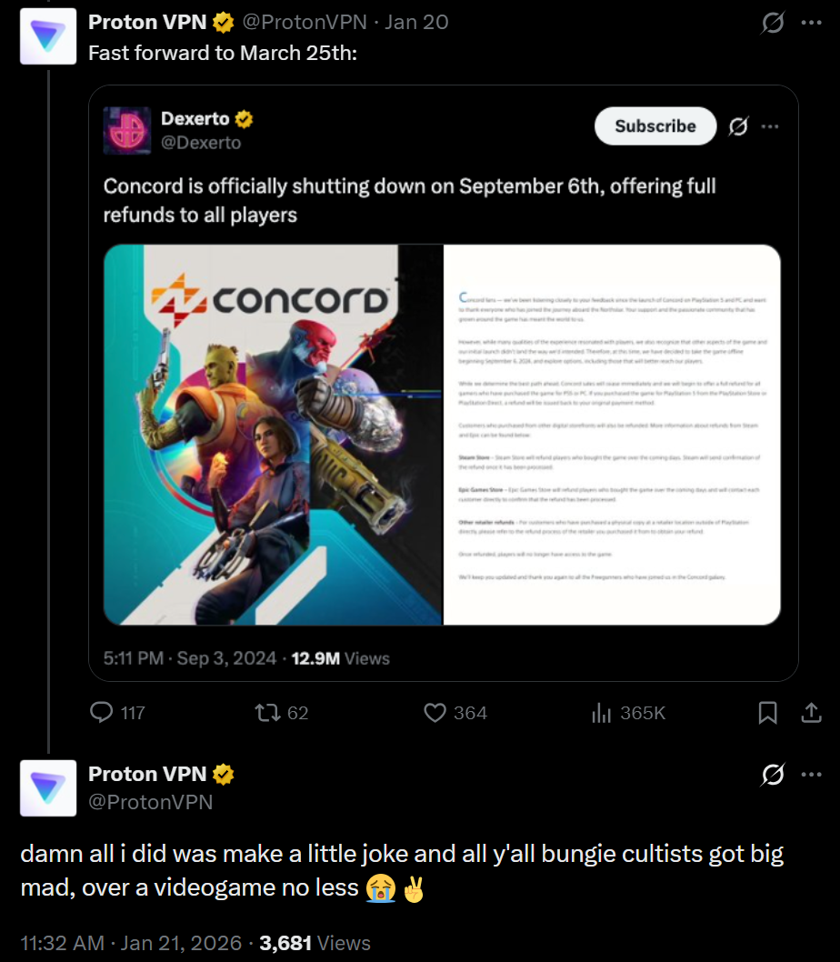 Конфликт начался в комментариях под постом PlayStation о старте предзаказов Marathon. Официальный аккаунт Proton решил вставить свои пять копеек, сравнив игру с провальной Concord. Эта шутка, которую сообщество мусолит уже несколько месяцев, на этот раз не встретила понимания. Получив в ответ волну негатива и крайне неудачное соотношение лайков к репостам, представитель сервиса не стал извиняться, а лишь подлил масла в огонь.