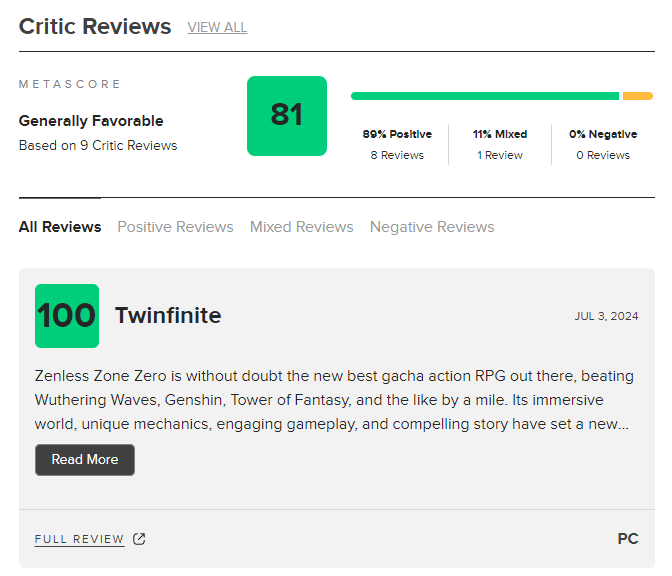 Выпущенная рано утром 4 июля Zenless Zone Zero получила высокие оценки от прессы. Если бы не страдающий от недостатка «сложности» автор GameSpot, который оценил игру на семерку, то средний балл ZZZ был бы выше. Сейчас у нее 81 балл по Metacritic.